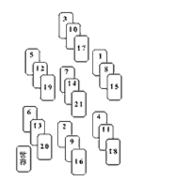洗牌後從上數,第七張放在1位,第十四張放在2位,第二十一張放在3位。