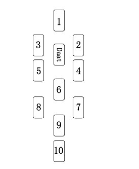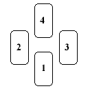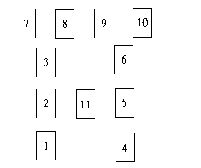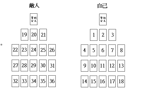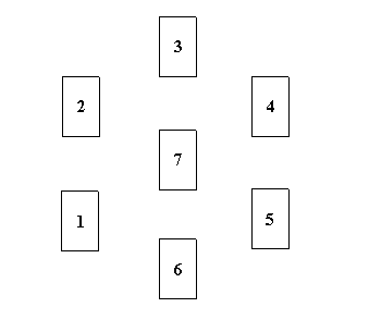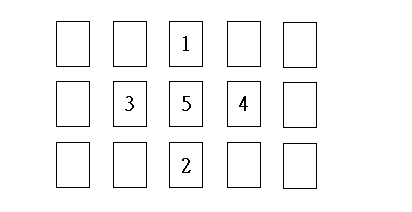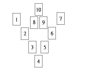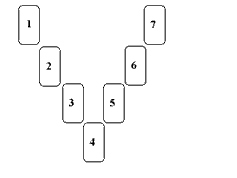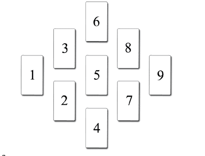 這種展開法非常簡單,通常適用於回答一個非具體的疑問。首先由詢問者洗牌,當確認他洗牌完畢,讓他用左手切牌(如果是左撇子則用右手)。接下來接過牌並按圖示排列