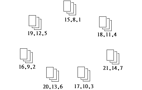 切牌後,從牌的上面開始數,第七、八、九張放在 1、2、3 位。然後再往下數,第七、八、九、十張(即第16、17、18、19張)放在 4、5、6 、7 位。