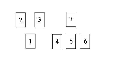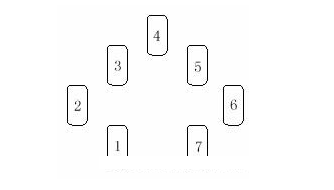 從切好的牌中,第七張放在 1 位,之後的四、五張(也就是第11、12張)放在 2.3 位,之後的第四、五、六張(即第16.17.18張)放在 4.5.6 位,之後的第四張(即22張)放在 7 位。