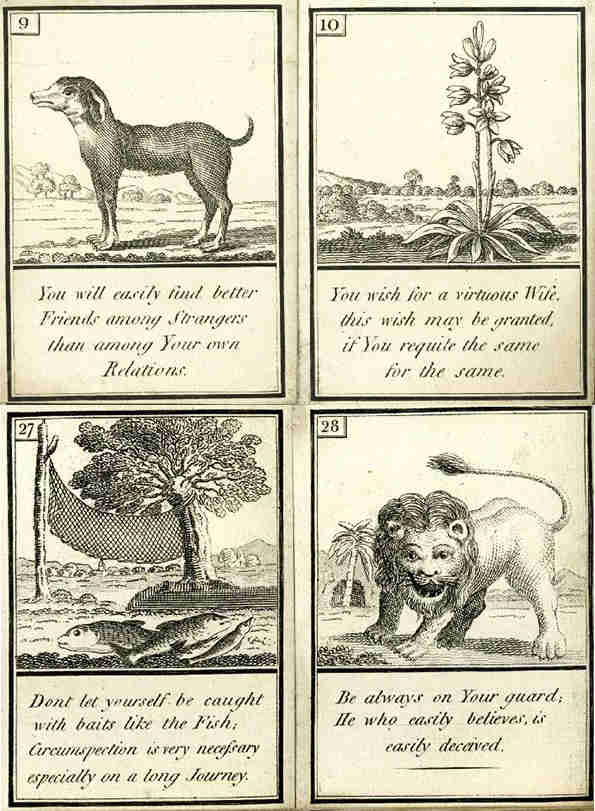 與大多數沒有小牌牌組的占卜牌不同,雷諾曼牌在用於占卜的圖解場景的基礎上有一個獨特的數位紙牌影像組合。 “最早的版本之一,叫做‘希望的遊戲’,有點像桌遊,是由一個名叫J.K.海克特爾(J.K. Hechtel)的德國人製作的,”馬修斯說, “你排出1到36張卡,遊戲的目的是擲骰子,並移動你自己的象徵物。如果你到了35號卡,那就是錨卡,那麼你就安全到家了。但如果你越過了這張卡,那就是十字路口,就不是很好了。有點像蛇梯棋遊戲一樣。” 就這樣,“希望遊戲”就進入了維多利亞時代的桌上棋牌遊戲傳統,這種遊戲决定了玩家的人生故事是基於運氣。
